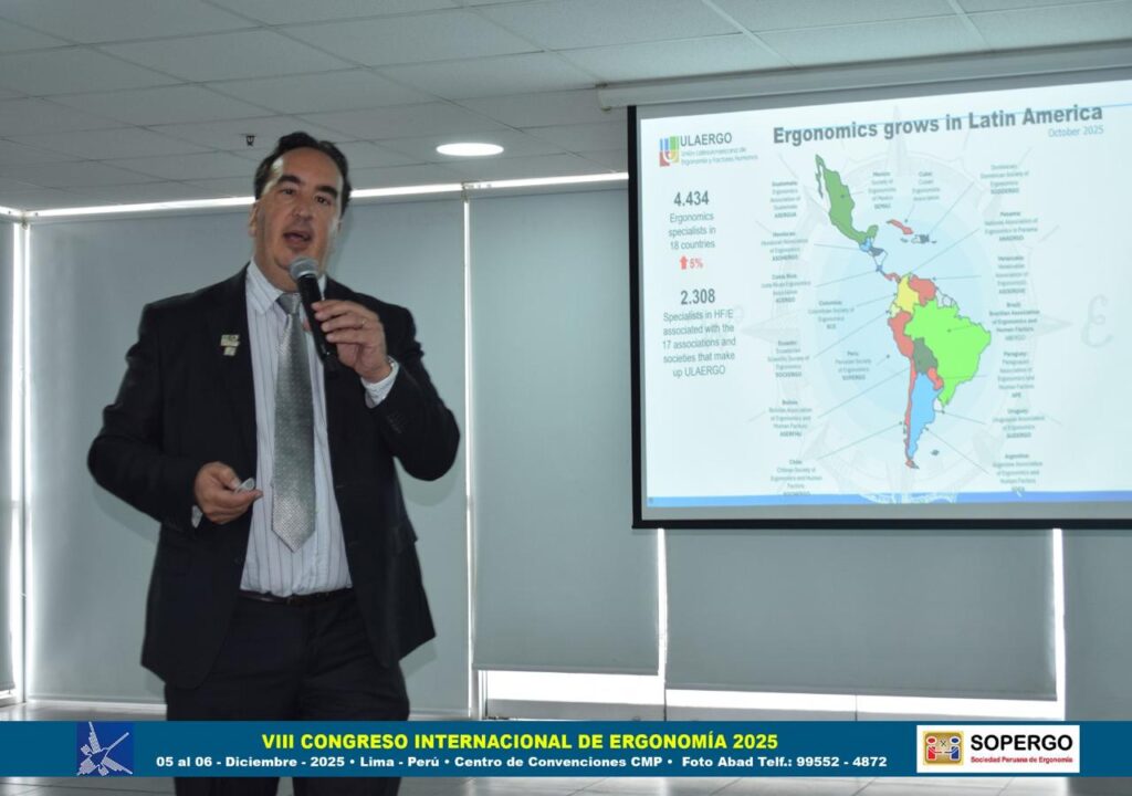 El 05 y 06 de diciembre de 2025 la Sociedad Peruana de Ergonomía (SOPERGO) organizó el VIII Congreso Internacional de Ergonomía en Perú, del cual participaron diferentes Ergónomos de Latinoamérica. El reciente electo presidente de la Ulaergo, Ing. Martín Rodríguez representó presencialmente a la Unión Latinoamericana de Ergonomia y a la IEA en este importante evento, el cual contó con más 100 participantes presenciales y a distancia. Gracias Sopergo por difundir la Ergonomia en Latinoamérica, nos vemos pronto en un próximo evento.